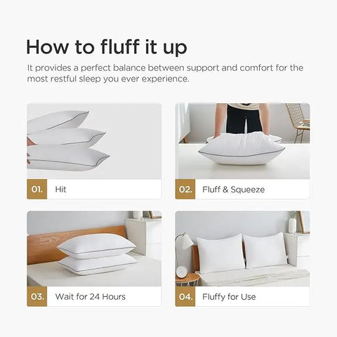 Comfy & Breathable Pillows -Our pillows are finished with well stitching and reinforced seams. The polyester case cover provides a smooth finish and superior soft feeling, making you feel like sleeping on a cloud.No matter what kind of sleeping positions you prefer, you can always get the experience five-star hotel luxury at home every night.