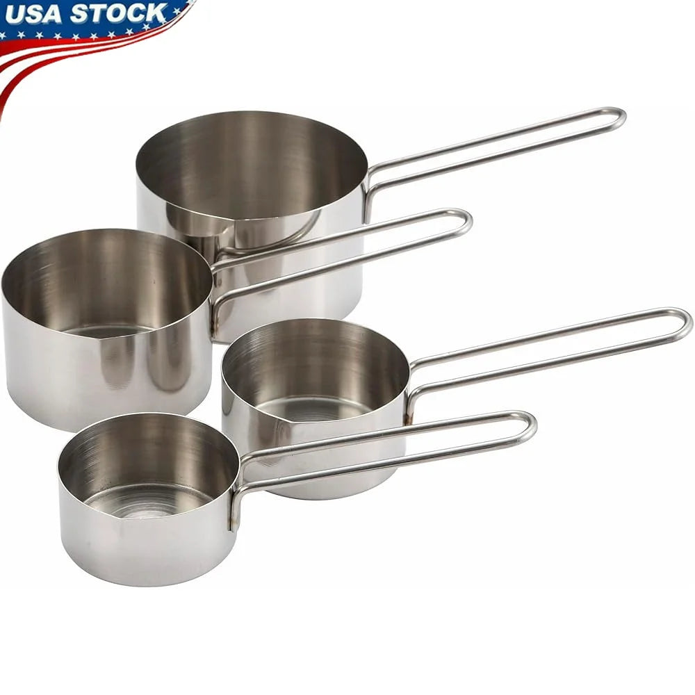 Stainless steel 4 piece set includes 1/4 cup, 1/3 cup, 1/2 cup, 1 cup Wire handles Dishwasher safe Durable and long lasting